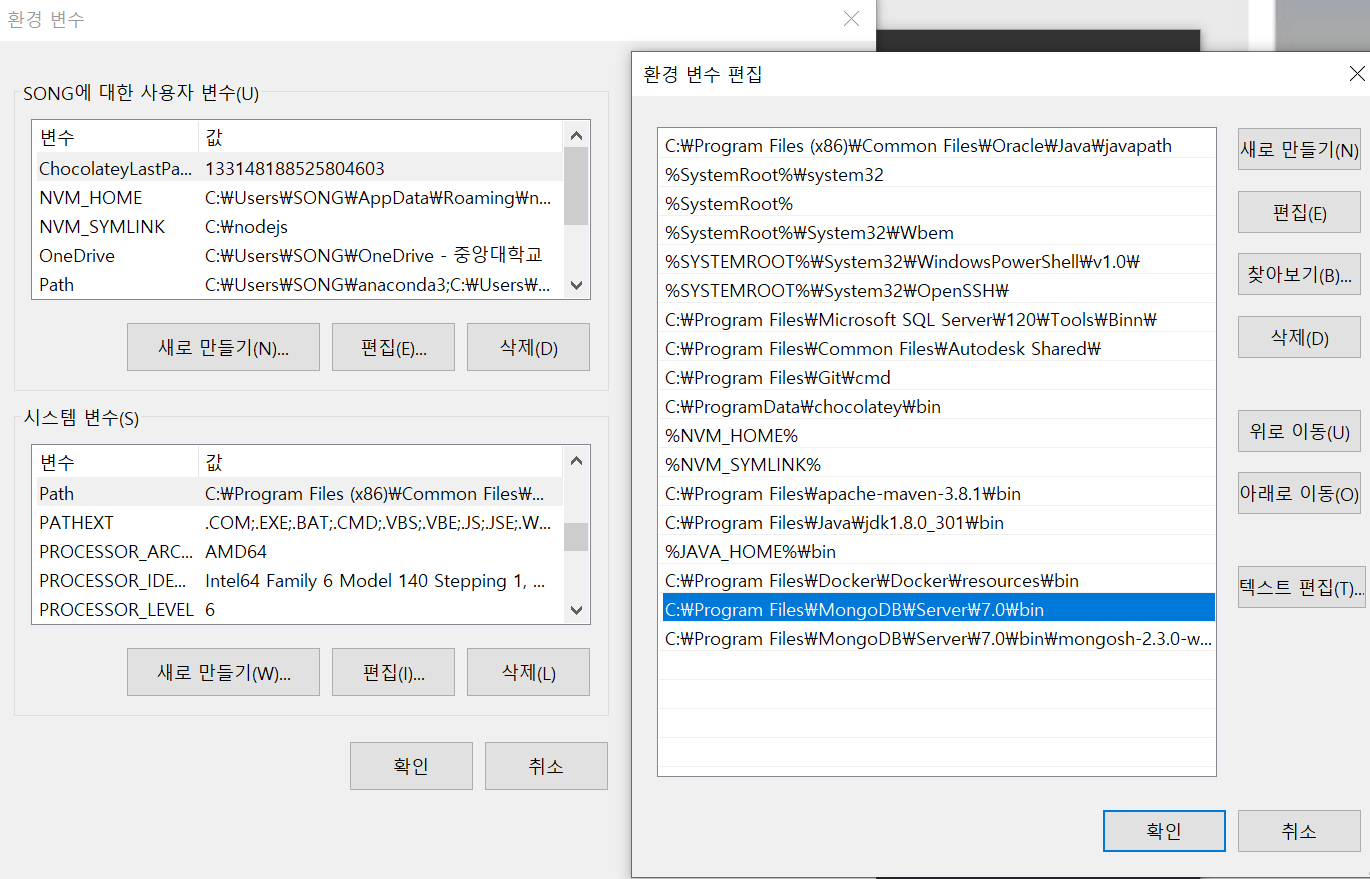 편의를 위해 환경변수를 편집하여 터미널에서 mongoDB와 mongoDB Shell을 쓸수있도록 설정한다.